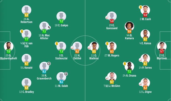 阿斯顿维拉首发:23-马丁内斯、2-卡什、4-孔萨、14-保·托雷斯(74'5-明斯)、12-迪涅(74'22-马特森)、24-阿马杜·奥纳纳、44-布巴卡尔·卡马拉、7-麦金(59'6-巴克利)、29-盖桑(59'17-马伦)、27-罗杰斯、11-沃特金斯(74'19-桑乔)